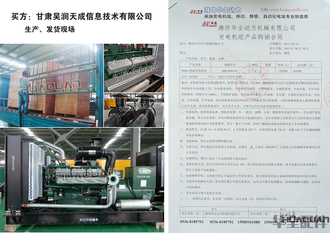 作為信息技術公司離不開電力的支持。為了避免因缺電、停電而造成的經(jīng)濟損失。甘肅吳潤天成信息技術有限公司在2014年8月30日、2015年11月12日分別在華全動力采購一臺柴油發(fā)電機組。
